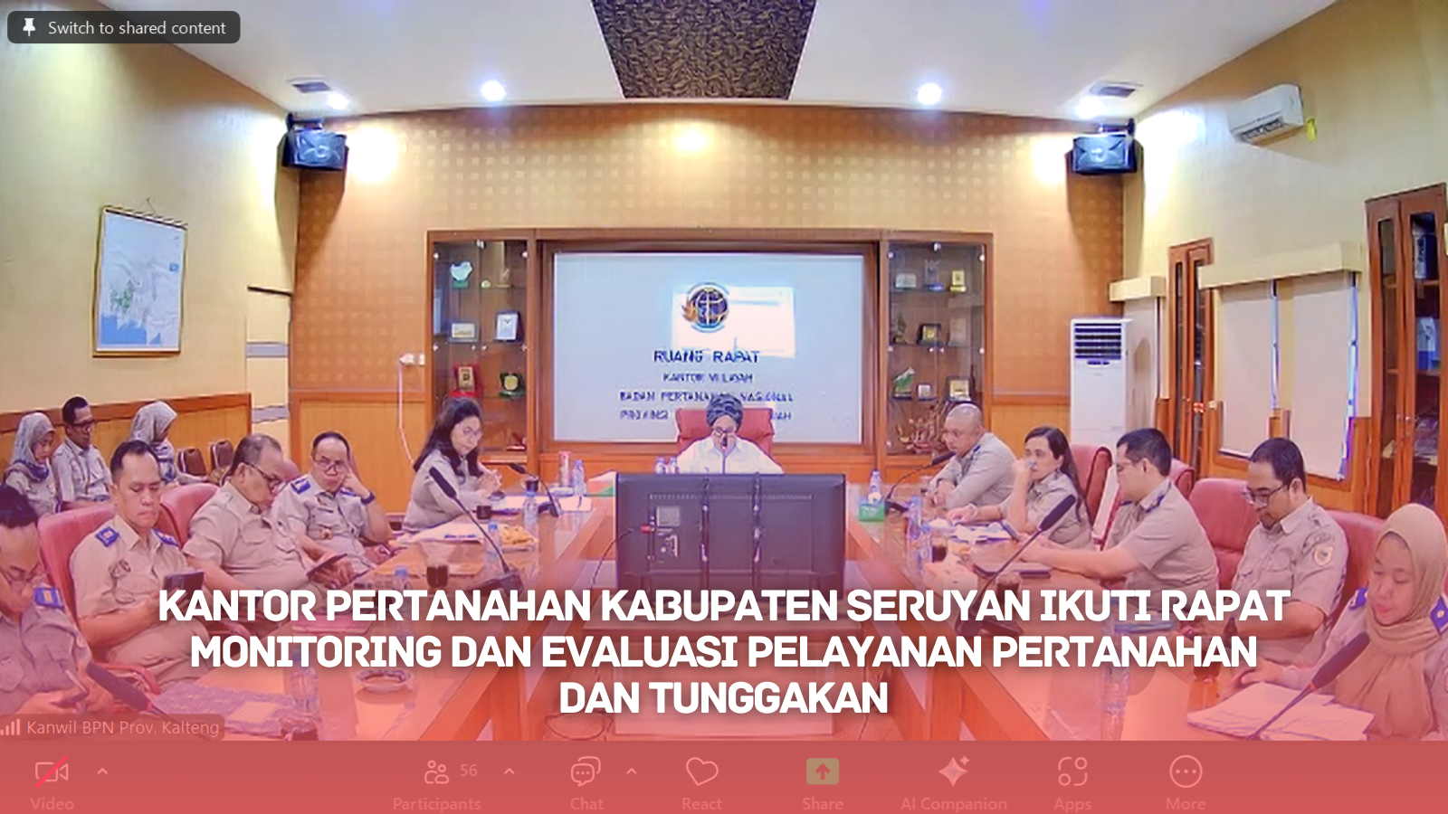 KUALA PEMBUANG – Kantor Pertanahan Kabupaten Seruyan mengikuti Rapat Monitoring dan Evaluasi (Monev) Pelayanan Pertanahan dan Tunggakan di Lingkungan Kantor Wilayah Badan Pertanahan Nasional (BPN) Provinsi Kalimantan Tengah. Kegiatan ini dipimpin langsung oleh Kepala Kantor Wilayah BPN Provinsi Kalimantan Tengah, Ibu Ir. Fitriyani Hasibuan, Dipl.Ph., M.M., dan dilaksanakan secara daring pada Senin, 29 September 2025.