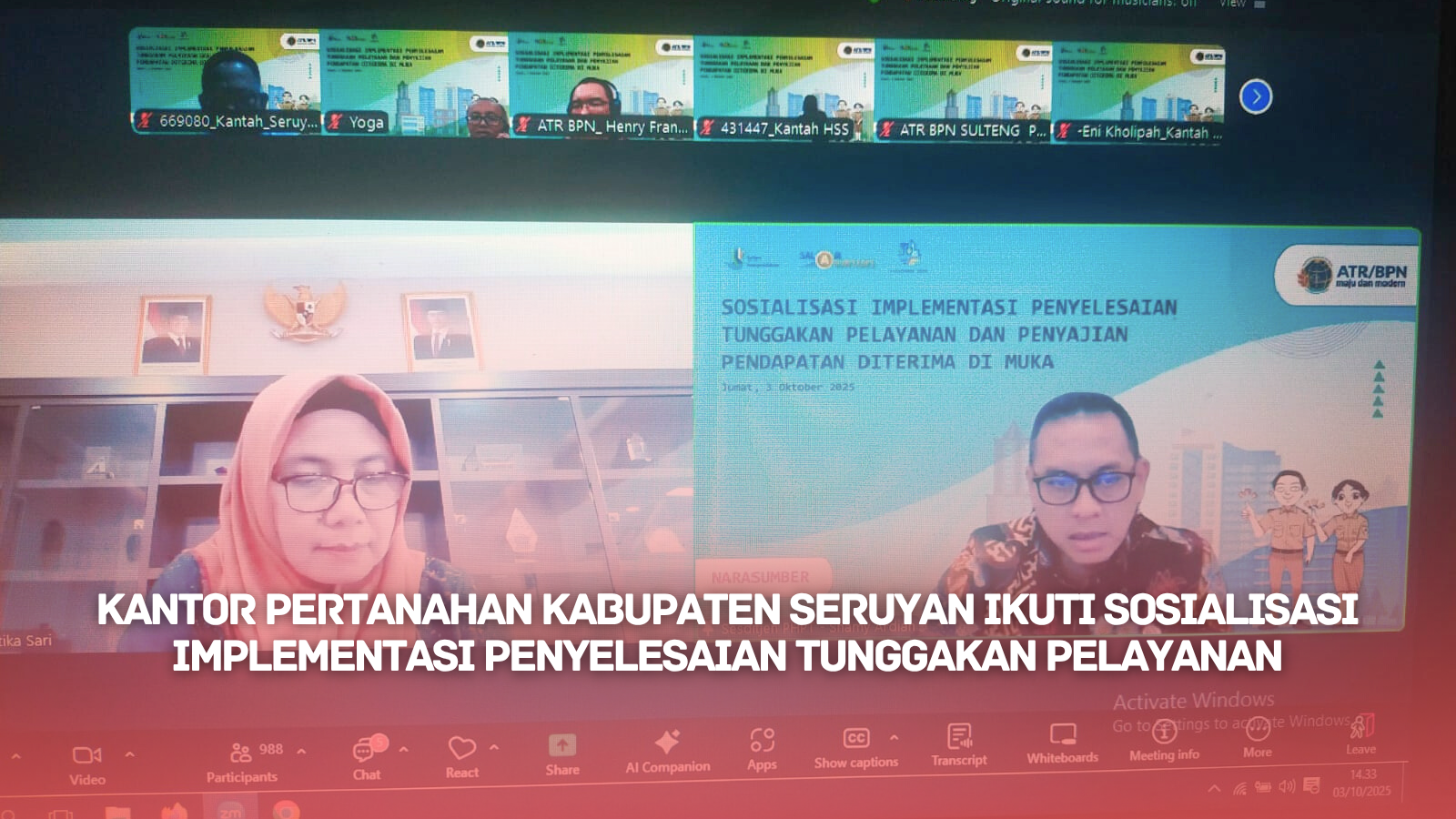 KUALA PEMBUANG – Kantor Pertanahan Kabupaten Seruyan mengikuti kegiatan Sosialisasi Implementasi Penyelesaian Tunggakan Pelayanan dan Penyajian Pendapatan Diterima di Muka yang dilaksanakan secara daring melalui aplikasi Zoom pada 03 Oktober 2025. Kegiatan ini diinisiasi oleh Kementerian Agraria dan Tata Ruang/Badan Pertanahan Nasional (ATR/BPN) sebagai upaya peningkatan kualitas pelayanan publik dan tata kelola administrasi.