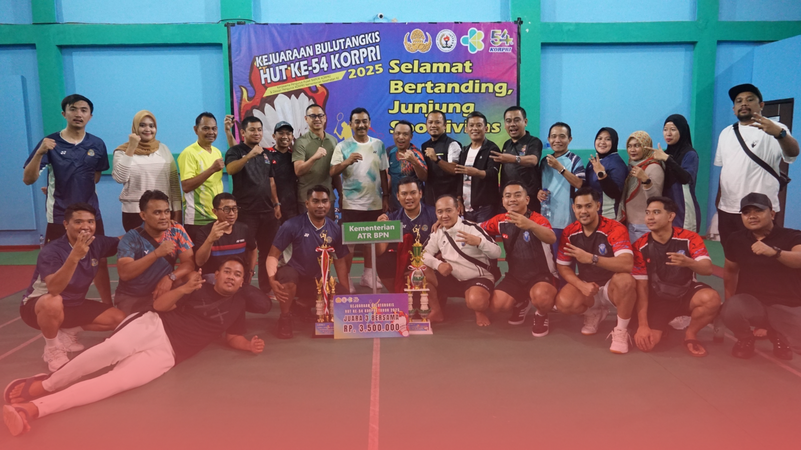 Kejuaraan Bulutangkis HUT ke-54 KORPRI merupakan bagian dari rangkaian kegiatan yang bertujuan memperkuat kebersamaan, sportivitas, serta semangat persatuan di lingkungan aparatur sipil negara. “Yang terpenting kita bisa sambil olahraga, sambil melepas lelah dari rutinitas bekerja, kita bisa sambil menyehatkan badan,” pungkas Sekretaris Jenderal Kementerian ATR/BPN.