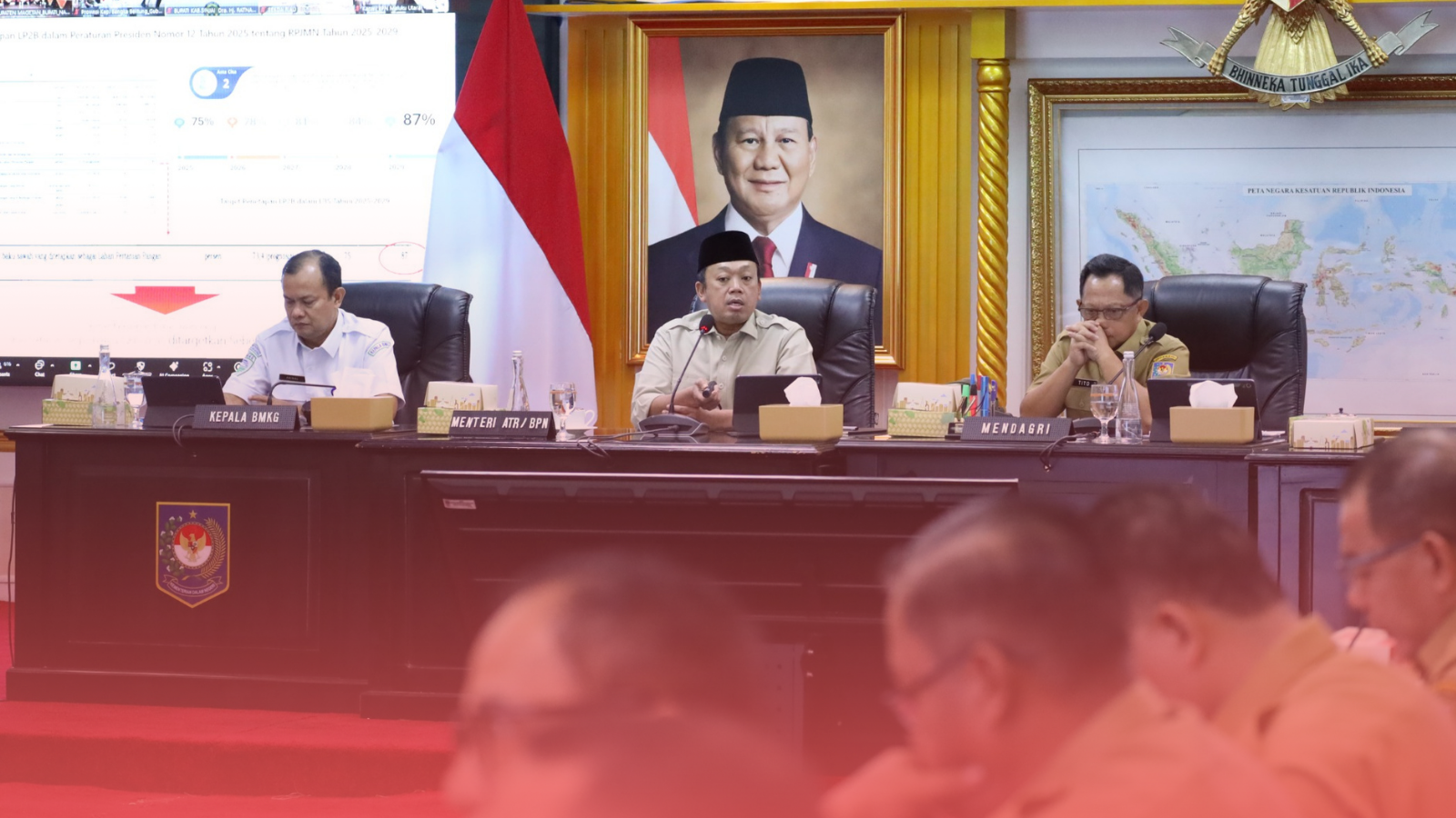 Turut hadir dalam rapat, Wakil Menteri Pertanian Sudaryono, dan juga perwakilan dari Badan Informasi Geospasial (BIG) serta Badan Meteorologi, Klimatologi, dan Geofisika (BMKG). Pada rapat kali ini, Menteri Nusron juga didampingi sejumlah Pejabat Pimpinan Tinggi Madya dan Pratama Kementerian ATR/BPN.