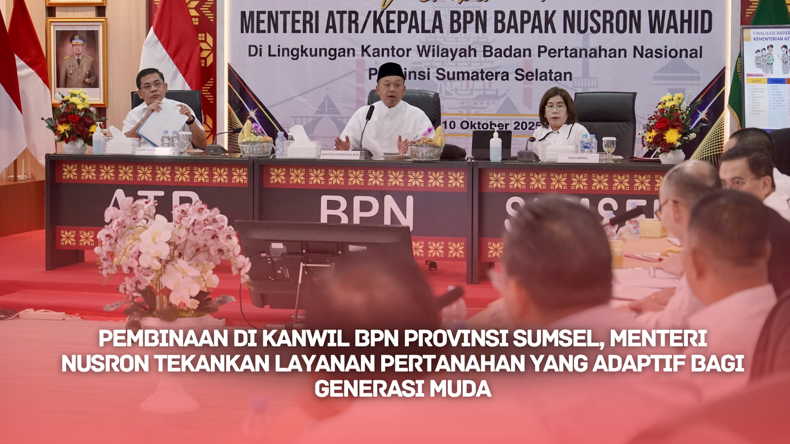 Hadir mendampingi Menteri Nusron dalam kegiatan pembinaan ini, Kepala Biro Hubungan Masyarakat dan Protokol, Harison Mocodompis; serta Kepala Kanwil BPN Provinsi Sumsel, Asnawati beserta jajaran.